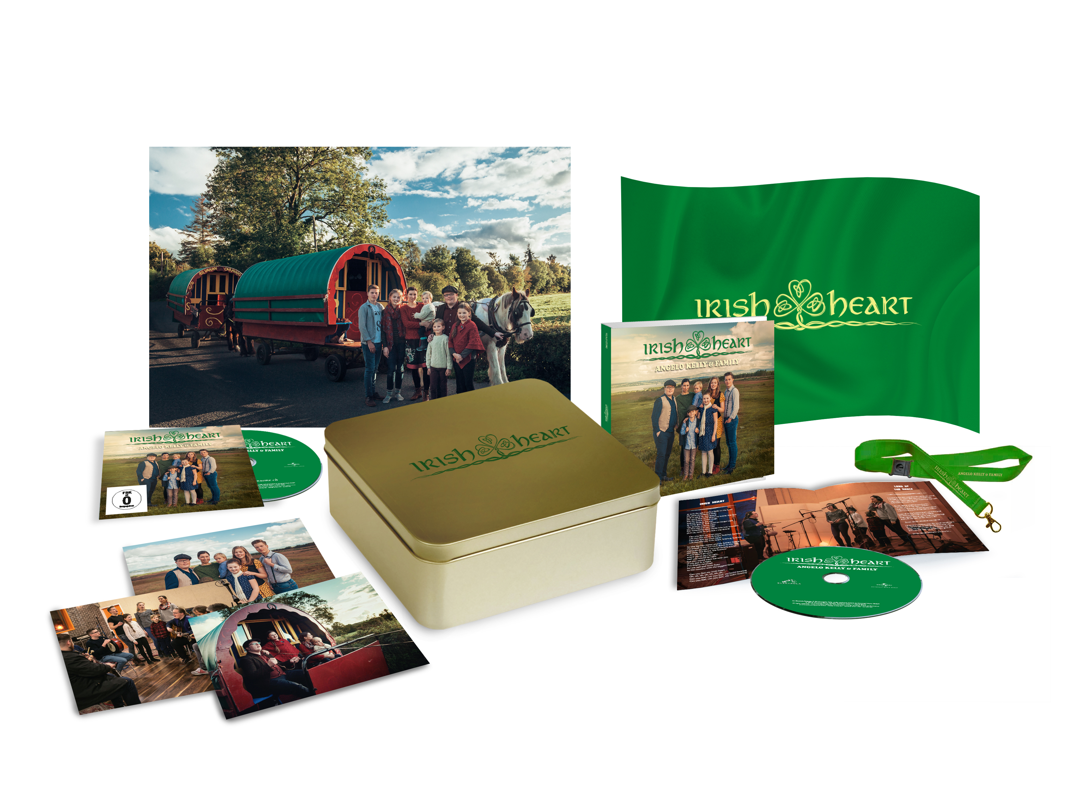 Irish Heart erscheint in diversen Konfigurationen: der Deluxe Edition mit 16 Songs und exklusivem Booklet, der Standard-CD mit 12 Titeln, einer Doppel-Vinyl mit tollem Artwork im Gatefold und großem Booklet mit exklusiven Motiven. Darüber hinaus gibt es auch eine limitierte Fanbox, welche die Deluxe Edition des Albums enthält, eine Karaoke CD, eine DVD mit dem Making Of des Albums, ein Schlüsselband, eine Flagge, ein Poster und drei Postkarten. Außerdem befindet sich in einer der limitieren Boxen ein goldenes Ticket – der glückliche Gewinner bekommt einen Besuch von Angelo Kelly abgestattet und darf ein exklusives Wohnzimmerkonzert mit Freunden und Familie erleben. Und in 20 der limitierten Boxen haben wir jeweils ein Silver Ticket deponiert. Die Gewinner erhalten jeweils zwei Tickets für ein Konzert von Angelo Kelly und Family und dürfen Sie bei einem Meet Greet persönlich kennenlernen.