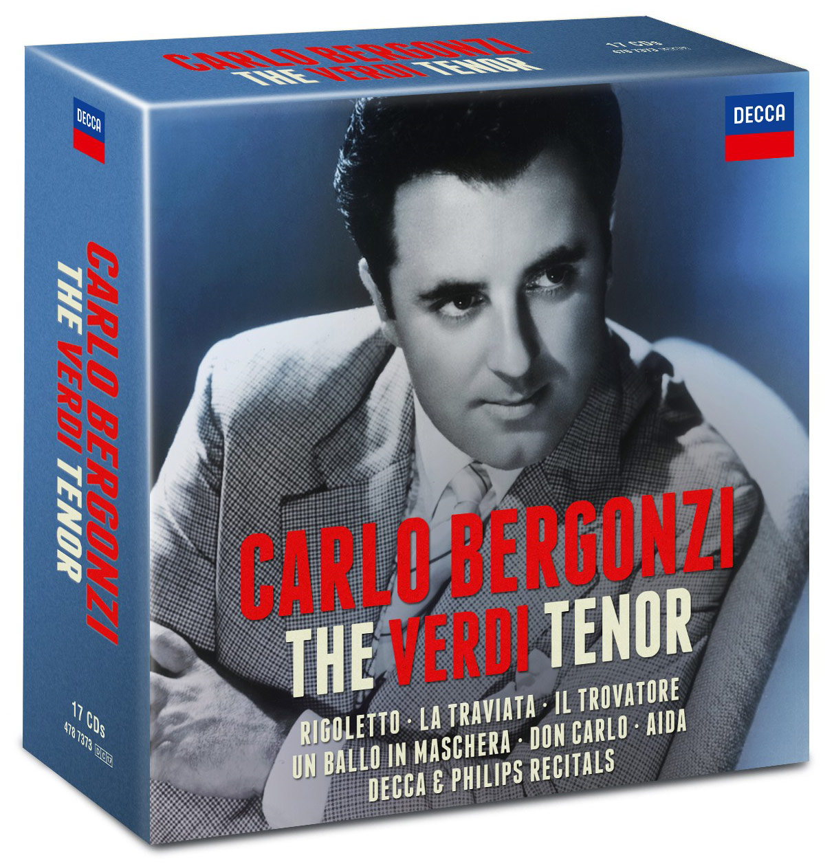 Decca präsentiert eine einmalige Zusammenstellung der größten Verdi-Aufnahmen des großen italienischen Belcanto-Tenors Carlo Bergonzi. Eine exklusive Auswahl und limitierte Edition bestehend aus 6 Opern und 2 Recitals auf 17 Tonträgern.