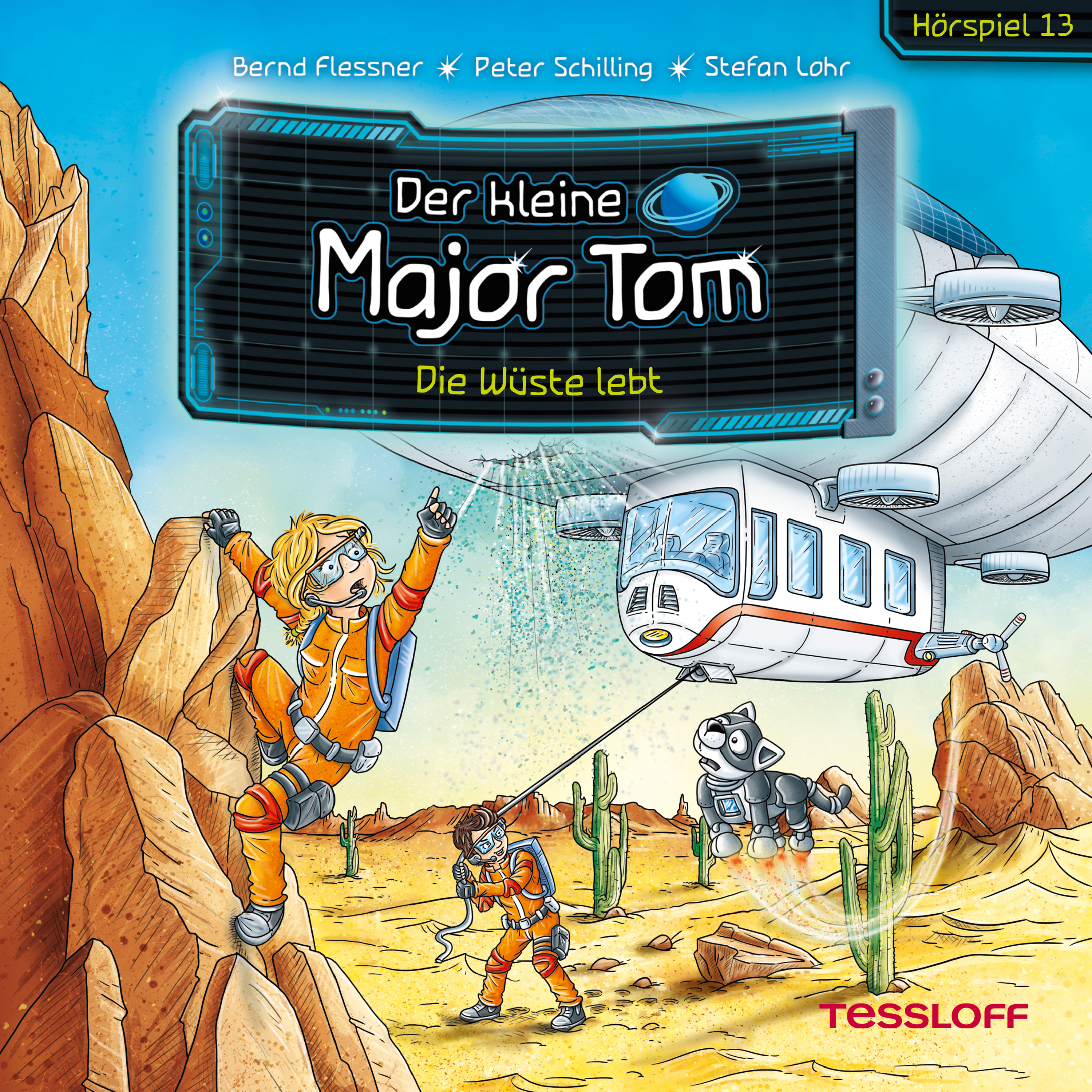 Auf der Bodenstation herrscht große Aufruhr. Zwei Forschungsdrohnen sind nach einem Sandsturm in der Wüste verschwunden. Der kleine Major Tom, seine Astronautenfreundin Stella und Roboterkatze Plutinchen begeben sich umgehend mit dem Luftschiff Airship Solar 1 auf die Suche nach ihnen. Auf der Reise zu dem Ort, von dem die letzten Funksignale der Drohnen ausgingen, droht das Luftschiff von einem Felsen zerstört zu werden. Außerdem geraten die drei Freunde in einen ungemütlichen Sturm. Ob die drei das Abenteuer Wüste heil überstehen, welche unerwarteten Entdeckungen sie machen und ob sie die Drohnen tatsächlich finden, erfahren wissenshungrige Kinder in diesem spannenden Abenteuer… Ein weiteres unterhaltsames Hörspiel mit einem galaktischen Weltraumabenteuer und jeder Menge Sachwissen.