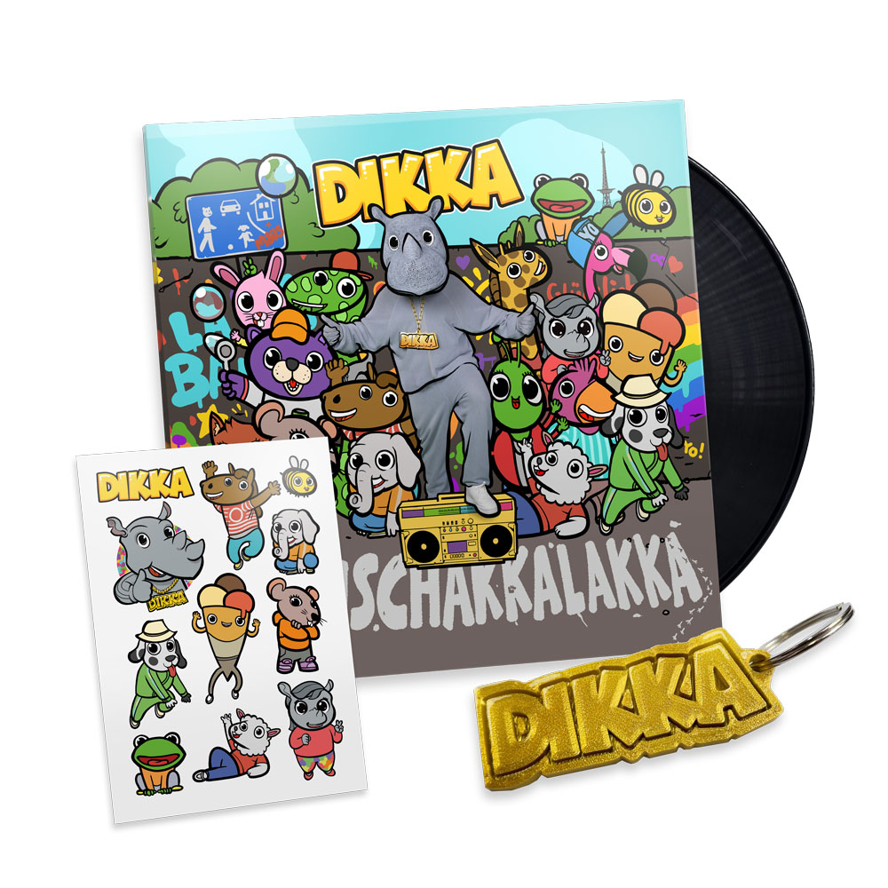 Das dikke Fan Paket (auf 250 Stück limitiert) mit unterschriebener “Boom Schakkalakka” Vinyl, Schlüsselanhänger aus echtem Nashorngold :-) und exklusivem DIKKA–Tattoo-Bogen.