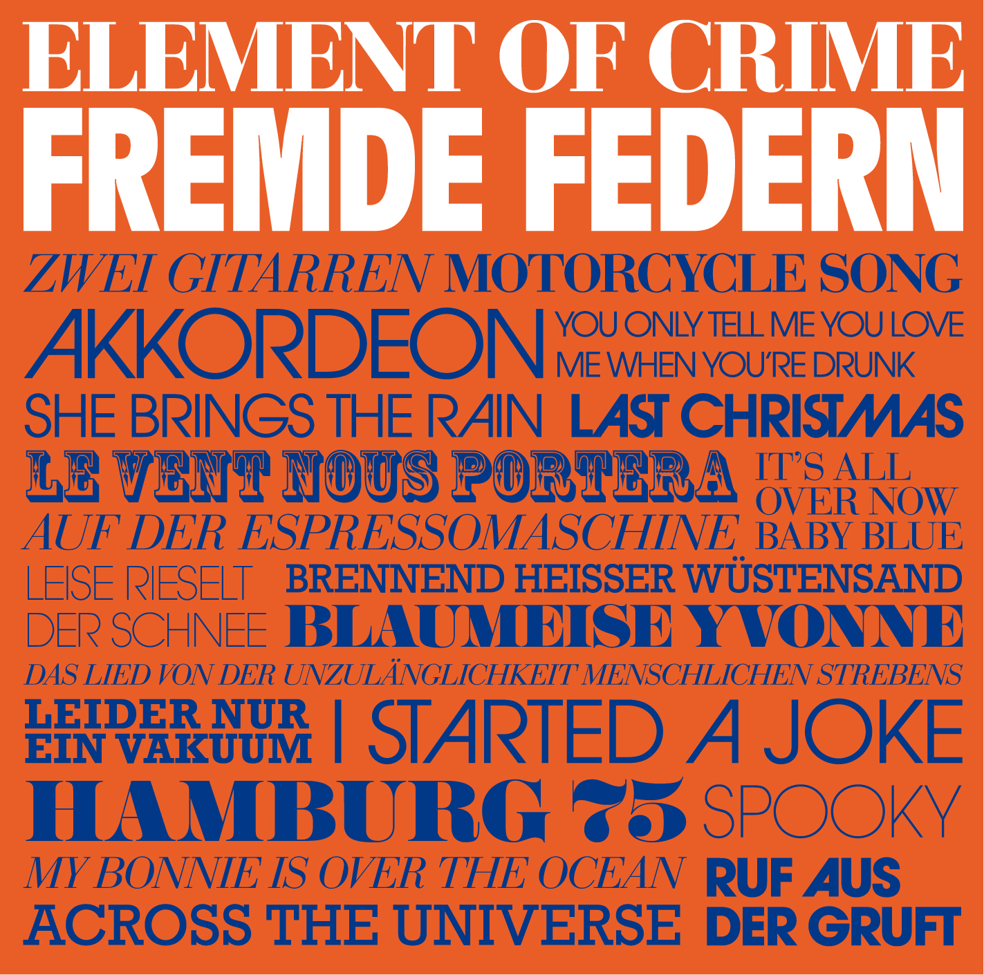 Das Ergebnis ist eine zauberhafte Platte. Wir hören Lieder, die wir sonst von Künstlern wie Alexandra, Dusty Springfield, den Pet Shop Boys, den Bee Gees, Udo Lindenberg, Bob Dylan und Freddy Quinn usw. kennen, plötzlich im Element-of-Crime-Sound und freuen uns, dass diese Band mühelos alle songschreiberischen Stilgrenzen ohne Angeberei und Rumgedaddel überschreitet und sich – so scheint es zumindest – alles aneignen kann, was ein Lied ist. Ob ursprünglich in Folk, Country, Krautrock, Schlager, Soulmusik, Deutschrock, Blues oder wo auch immer beheimatet – bei ELEMENT OF CRIME werden diese Songs neu eingekleidet in das herbe, grobgestrickte Indierock-Kleid einer Band, die einen unverwechselbaren Sound ihr eigen nennt und deshalb vor nichts Angst hat. Und so hören wir Freddie Quinns “Heimweh” oder Serge Gainsbourgs (bzw. Alexandras) “Akkordeon” mit ganz neuen Ohren, wir sehen Cans “She Brings The Rain” oder Udo Lindenbergs “Vakuum” mit ganz neuen Augen, die Pet Shop Boys und die Bee Gees werden Hippies und Arlo Guthrie und Gottfried & Lonzo werden Punks, wir begegnen Legenden wie Andreas Dorau, Wham und den Beatles, und immer, immer ist es ELEMENT OF CRIME – wie machen die das?