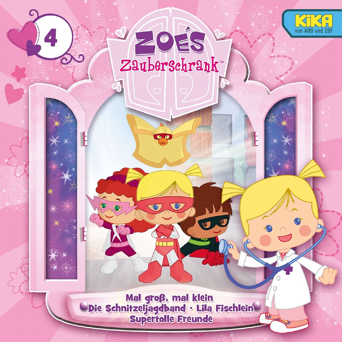 Auf dieser CD erleben Zoé und ihre Freunde diese Abenteuer: MAL GROSS, MAL KLEIN · DIE SCHNITZELJAGDBAND · LILA FISCHLEIN · SUPERTOLLE FREUNDE